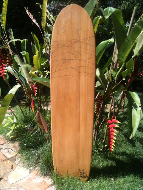 Estas alaias fish foram feitas à partir de tábuas de kiri japonês (paulownia) que estavam apodrecendo no tempo após uma tentativa de serem queimadas por seu antigo dono. As tábuas foram salvas e transformadas em prancha de surf que além de correrem as águas foram pirografadas para uso decorativo, pendurada na parede ou usada sobre pés como banco ou aparador.